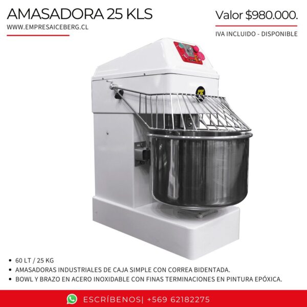 Amasadora de 25 kg con bowl de acero inoxidable y correa bidentada.