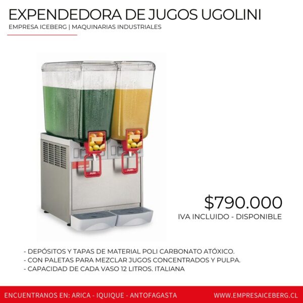 La Expendedora De Jugos Ugolini es un equipo diseñado para dispensar jugos y bebidas de manera eficiente y segura. Ideal para establecimientos de comida, cafeterías y restaurantes.