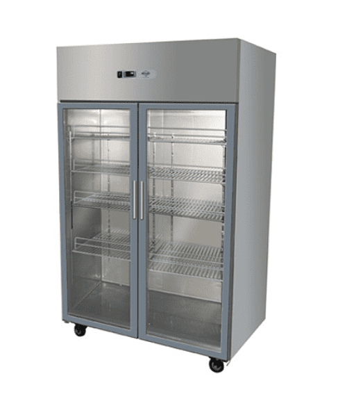 Refrigerador de 1000 litros con puertas de vidrio doble panel y control electrónico de T°. Almacenamiento eficiente de productos frescos.